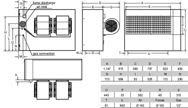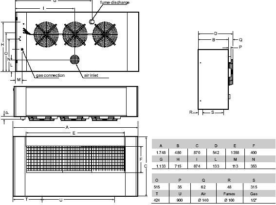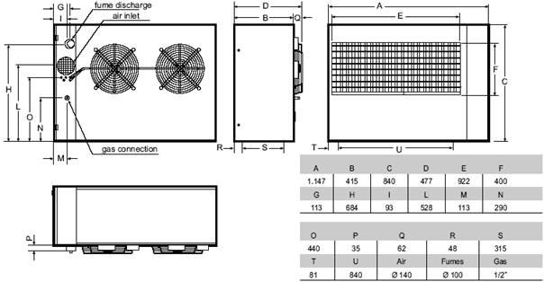 Kućište je izrađeno od čeličnog lima lakiranog epoksidnim prahom što garantira dugi vijek trajanja. Na prednjem dijelu se nalazi otvor za izbacivanje tretiranog zraka predviđen za kanalsku izvedbu. Na izmjenjivaču nalazi se termostat ventilatora i osjetnik sigurnosnog termostata. Također se nalazi otvor za električni priključak kod eventualne montaže protupožarne zaklopke.